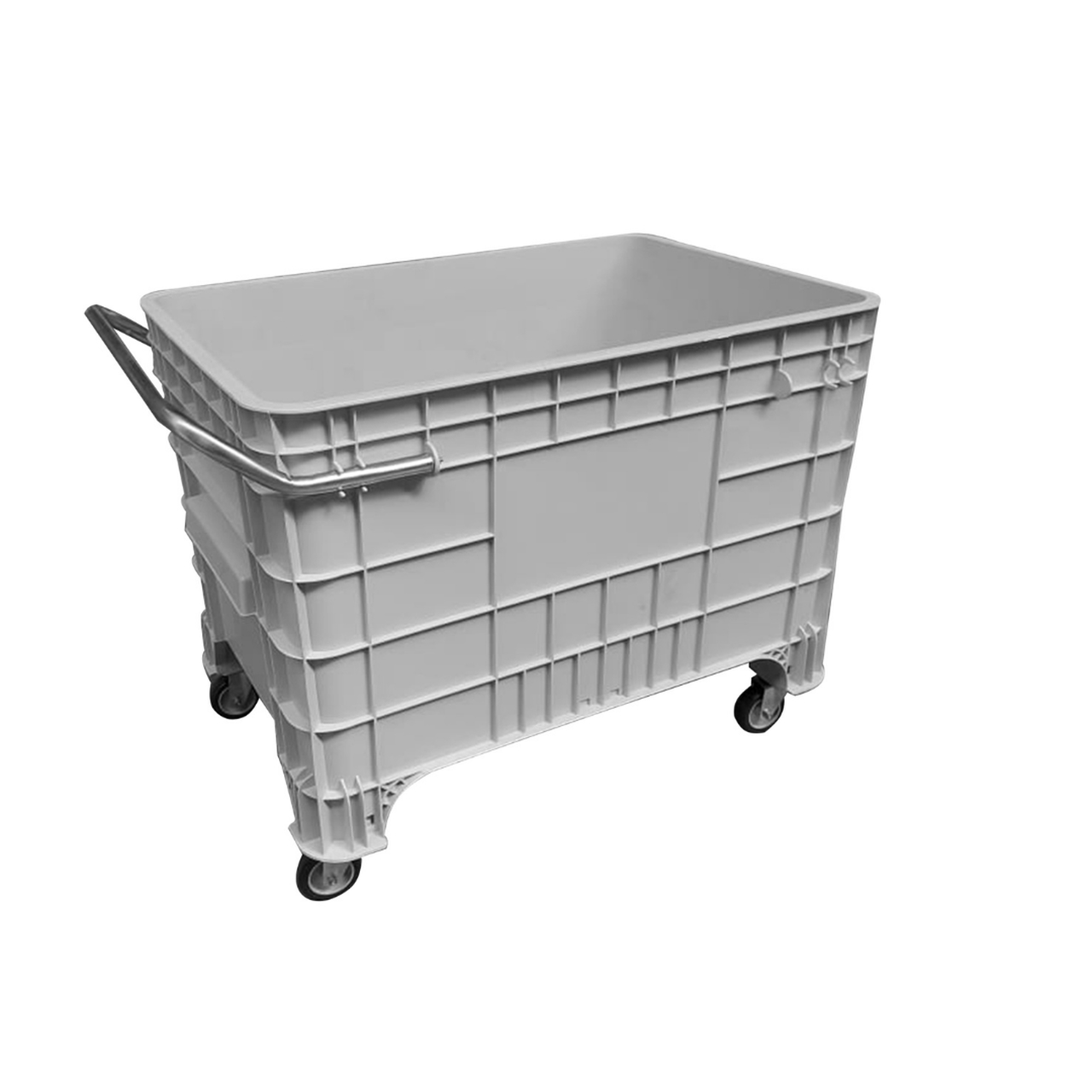 Possui puxador lateral ergonômico que facilita o manuseio e 04 rodízios reforçados, sendo 02 fixos e 02 giratórios, garantindo mobilidade mesmo quando totalmente carregada. É uma solução prática, durável e de fácil higienização, ideal para ambientes comerciais, industriais e logísticos.