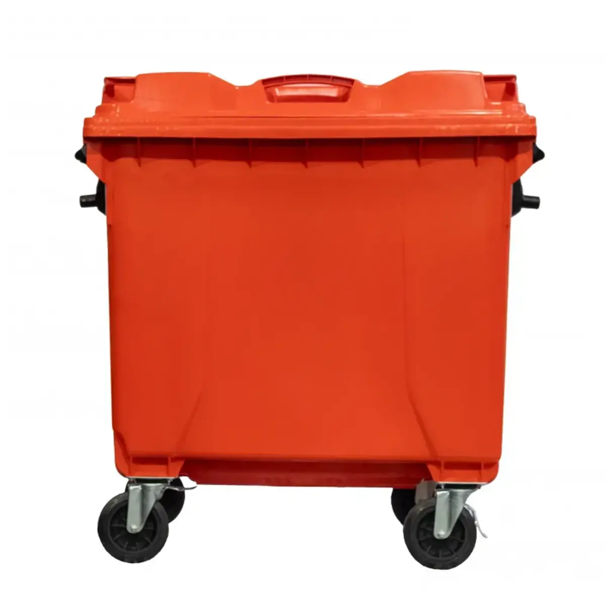 Container de lixo com capacidade de 1000 litros, fabricado em polietileno de alta densidade (PEAD) ou polipropileno (PP), oferecendo alta resistência, durabilidade e segurança.