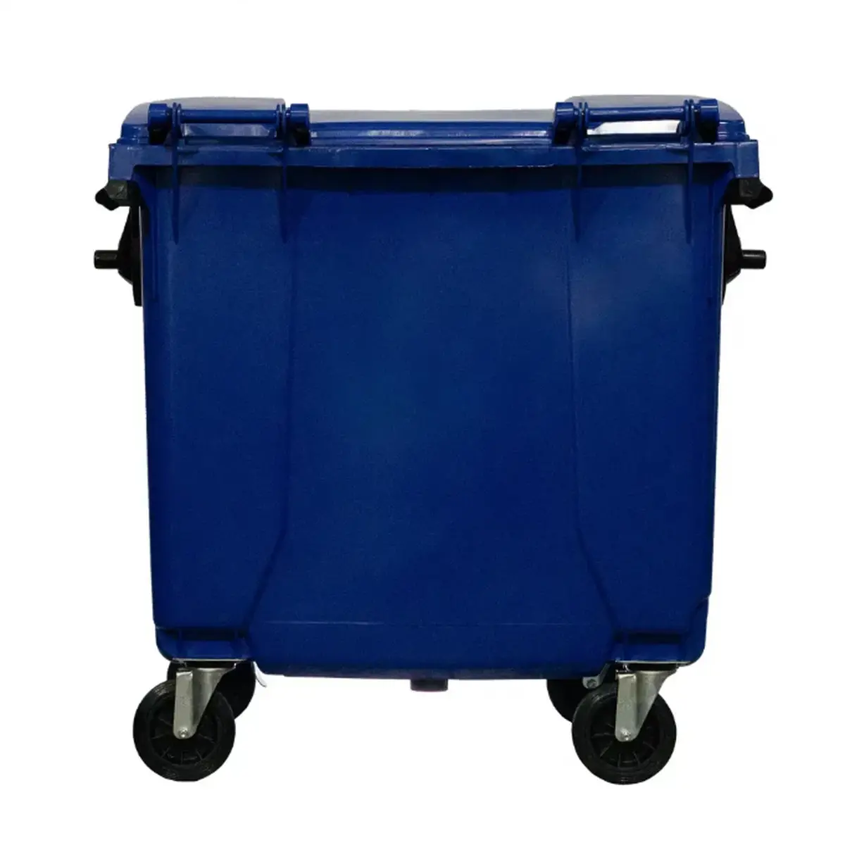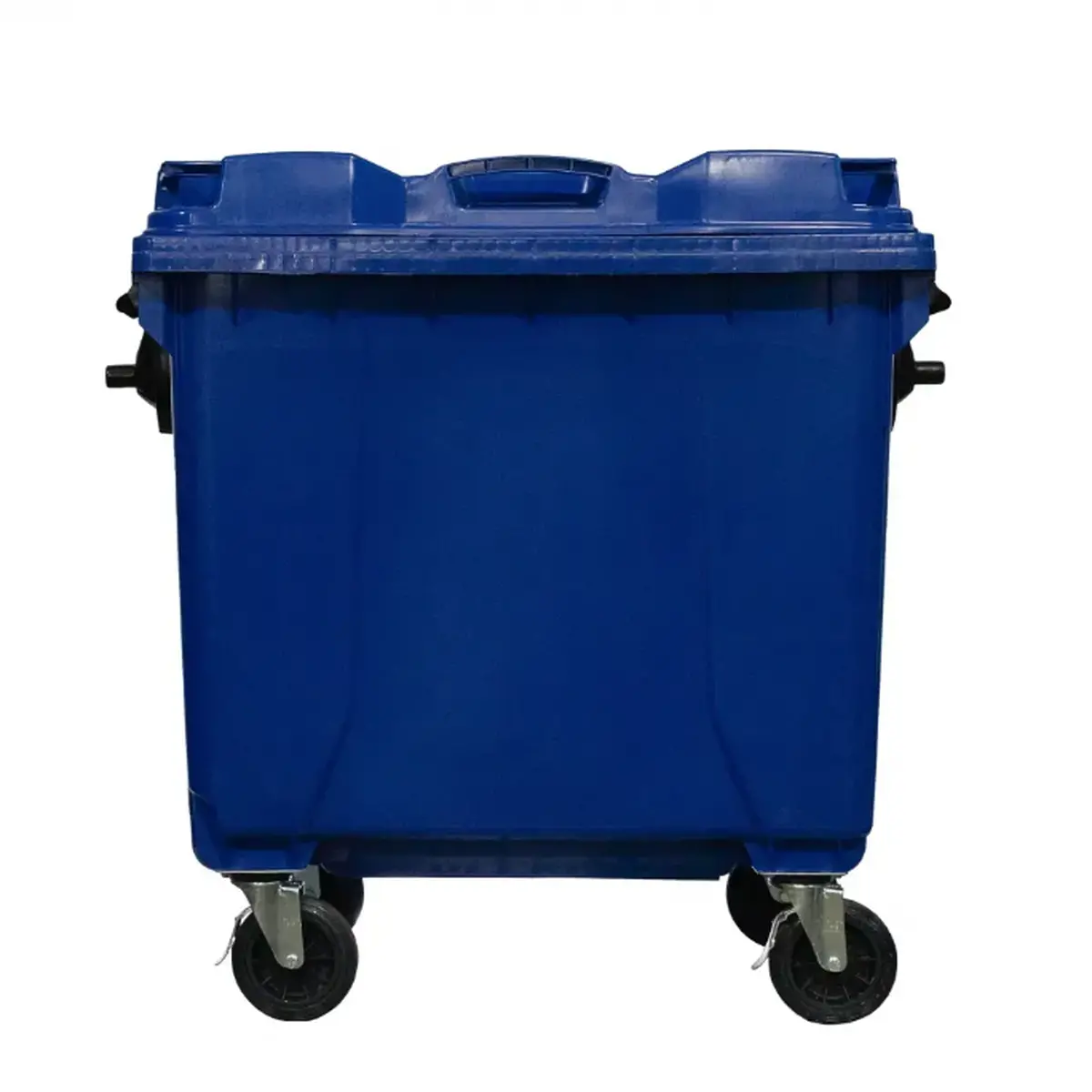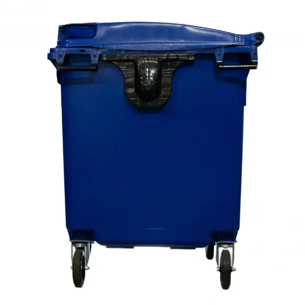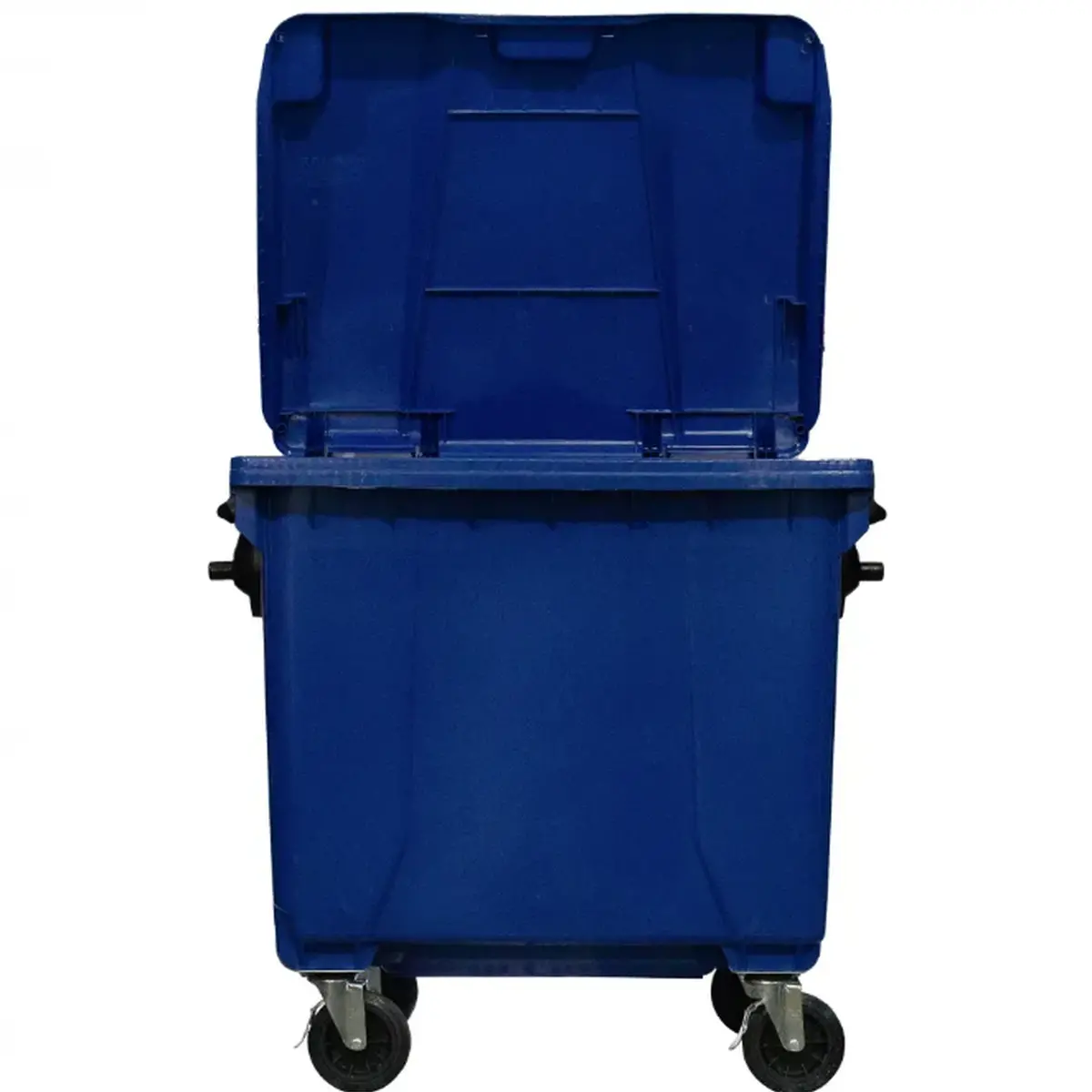 Container de lixo com capacidade de 1000 litros, fabricado em polietileno de alta densidade (PEAD) ou polipropileno (PP), oferecendo alta resistência, durabilidade e segurança.